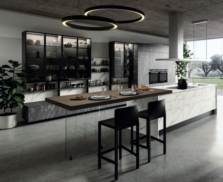 La continuità dello spazio dedicato alla cucina con il resto della zona living è uno dei primi obiettivi del marchio Aran, tanto da progettare per ogni modello anche degli elementi d’arredo utili per definire la zona “soggiorno”.