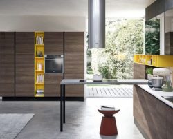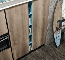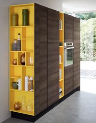 Le linee oblique dei pensili rompono lo schema delle basi orizzontali, ciò crea un dinamismo che continua ad essere esaltato dal frapporsi dei moduli aperti con quelli chiusi, come nell’esempio di seguito riportato, in cui la sequenza delle colonne frigo, forno e dispensa è interrotta da un vano a giorno a contrasto, utilissimo per tenere sempre a portata di mano tutti i libri di cucina.