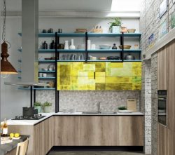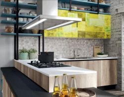 oppure i pensili in vetro nell’immagine di seguito, impreziosiscono con leggerezza la composizione, inoltre l’inserimento di led illumina l’interno dei mobili, creando un’atmosfera calda e accogliente e rendendo tutto più ordinato ed a portata di mano
