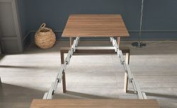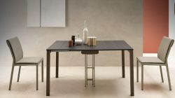 Il meccanismo telescopico in alluminio ne permette l’allungo trasformandola in un comodissimo tavolo da pranzo da 4 (con tre allunghe) fino a 8 (con 5 allunghe) posti. La solida base d’appoggio è studiata nei minimi dettagli ergonomici per sorreggere in assoluta sicurezza il tavolo nella sua massima estensione; l’evoluzione di questa consolle è in equilibrio con il design delle sue forme e garantisce la salvaguardia dello spazio ed al contempo la massima ospitalità e convivialità di un tavolo da pranzo.