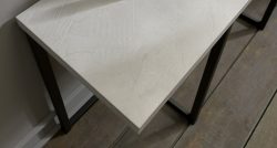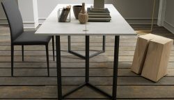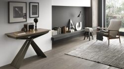 Una consolle di ultima generazione, la forma scultorea della struttura portante in metallo scarica sulle due linee che convergono nel nodo centrale; da qui parte il sostegno del piano, che alleggerisce l’intera struttura, ed è disponibile in diverse finiture (legno impiallacciato, nobilitato, effetto malta, laccato poro aperto e ceramica).