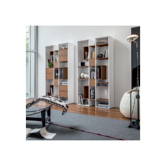 Libreria ad elementi modulari che permettono di personalizzarla ed adattarla ai propri ambienti. Realizzata in MDF laccato presenta degli inserti in noce canaletto o rovere scuro con schienale lucido che la rendono originale e dinamica.