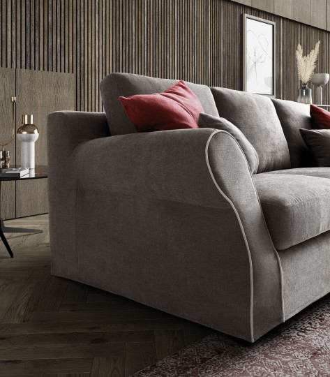Le esili linee in rilievo, le quali determinano il profilo dei braccioli, si sovrappongono elegantemente alla delicatezza della struttura compositiva, dando vita al divano moderno Abby, della LeComfort Italia.