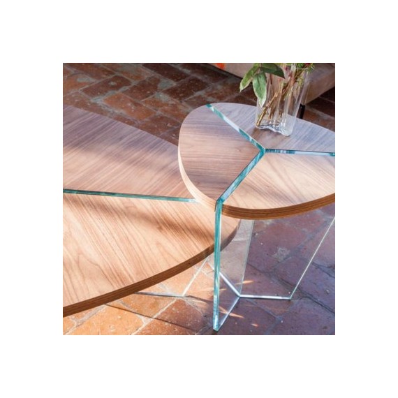Tavolino con base interamente in vetro, incastonato come se fosse un diamante per creare un gioco di materiali unico come nello stile di Tonin Casa.