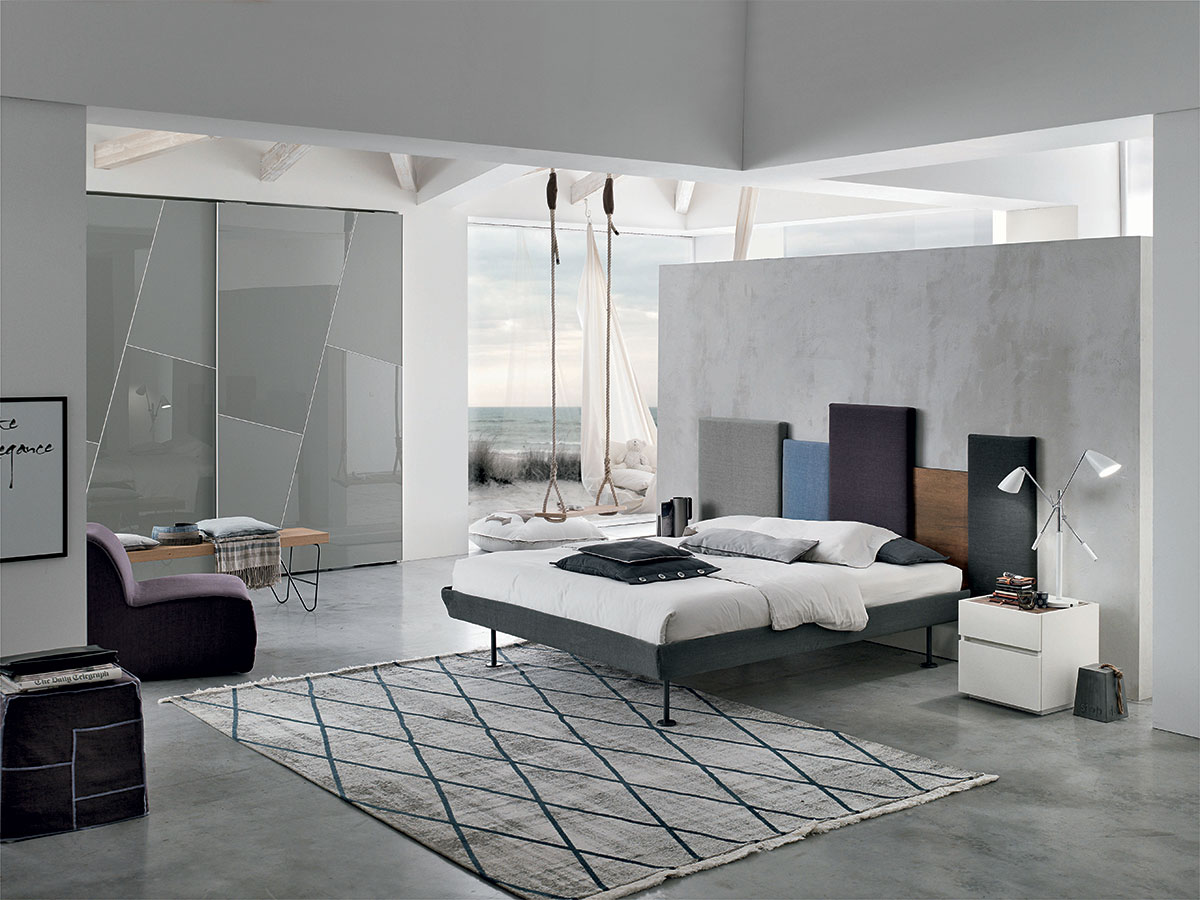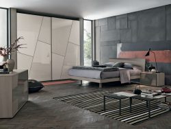 L’ armadio anta scorrevole Kross, di Tomasella, è caratterizzato da una struttura in laccato opaco madreperla 124, con ante in vetro lucido madreperla 324 e satinato madreperla 424 con profili in laccato opaco smoke 128.