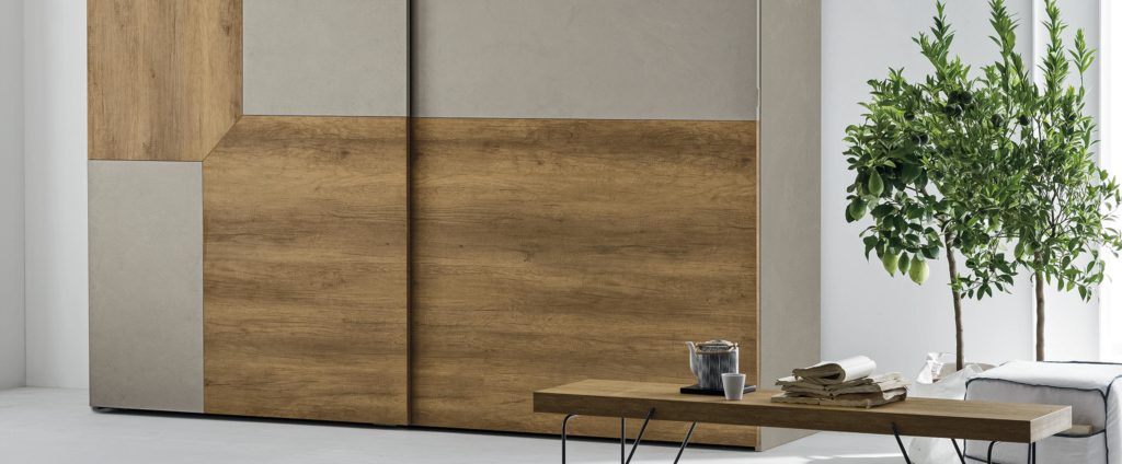 L’ armadio moderno Remix + Double, di Tomasella, è caratterizzato da linee dritte, orizzontali e verticali, e linee diagonali, che si incontrano sulle ante dell’ armadio ad anta scorrevole disegnando inedite geometrie.