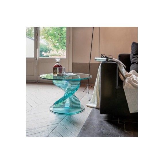 Tavolino realizzato tramite speciali tecniche di lavorazione del vetro. Il basamento è una vera e propria scultura di vetro che genera mille riflessi e rende singolare Ariel. Disponibile in due diverse dimensioni.