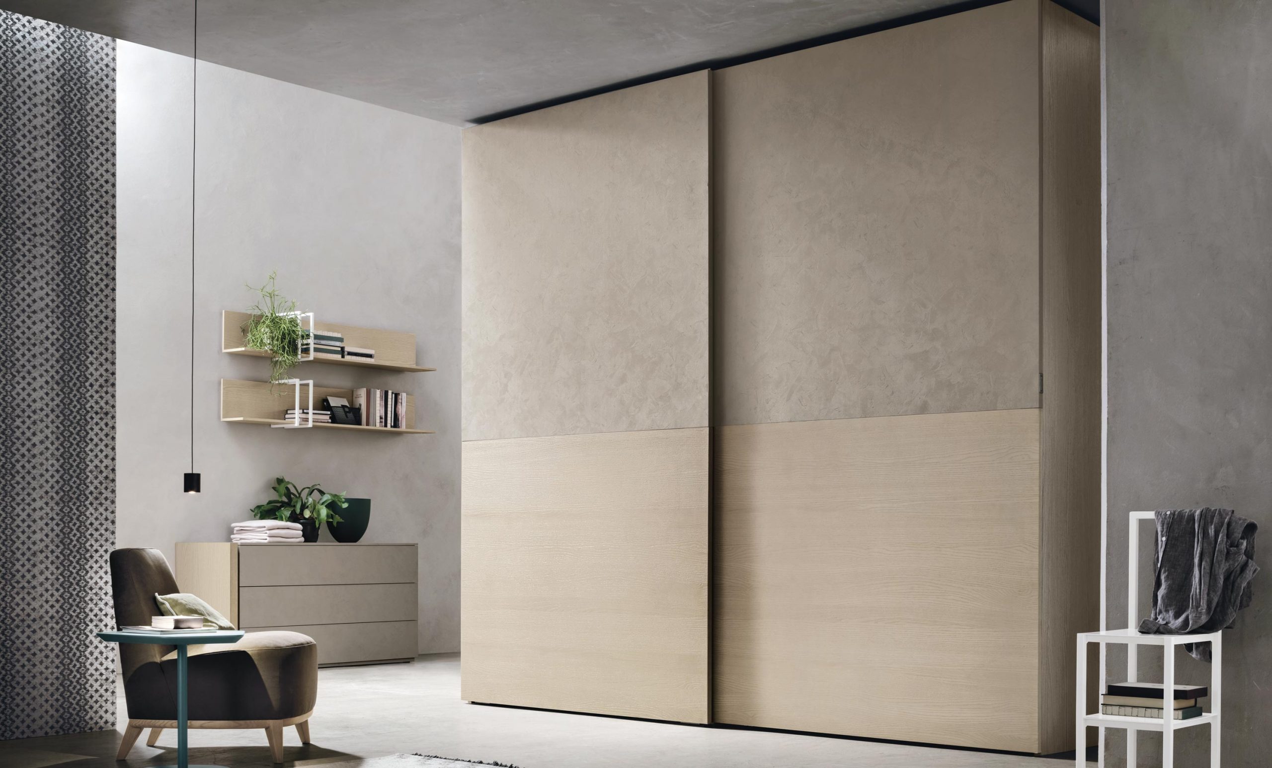 Finiture della foto / Doris ante scorrevoli materico cemento chiaro. Maniglia integrata metallo madreperla. Struttura materico cemento chiaro.