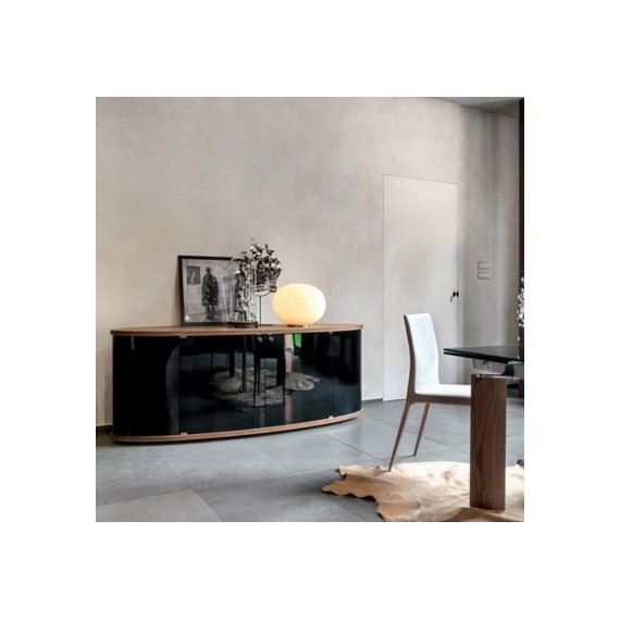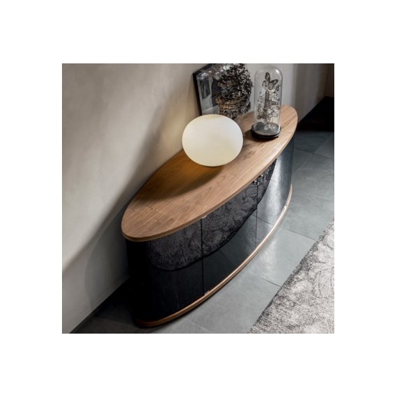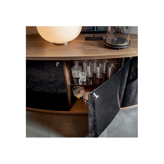 Madia elittica in legno con ante e fianchi in vetro curvo. Disponibile in diverse finuiture. Forme arrotondate e morbide per una madia che arreda con gusto e distinzione.