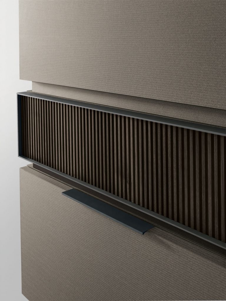 Nelle foto l’anta Vinci con profilo in metallo e frontale disponibile in diverse finiture. Un elemento originale per dare movimento alla composizione.