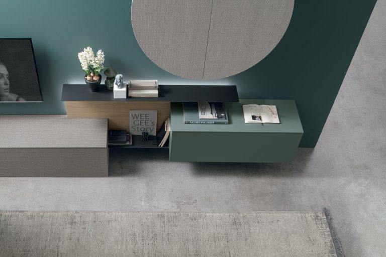 La Parete Attrezzata Atlante UNIT AT118 di Tomasella nell’immagine ha componibilità su misura e varie possibilità di personalizzazione.