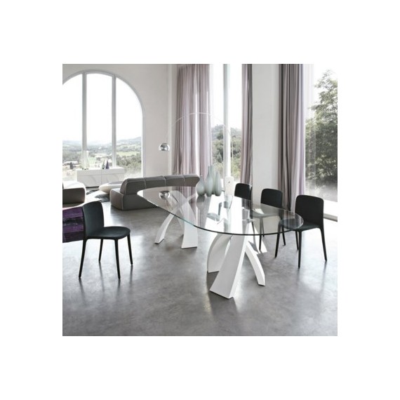 Tavolo con vetro temperato sagomato e basi in metallo verniciato. Big Eliseo è perfetto per chi vuole rendere la propria sala unica con estrema pulizia formale ed esclusiva.