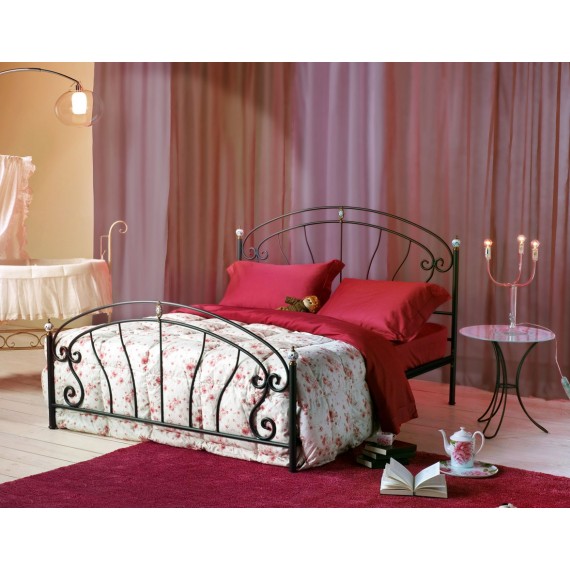 Letto in ferro battuto con particolari in ottone e ceramica decorata a mano. Per rete da cm. 160 x 190, ingombro cm. 168 x 202, altezza testata cm. 125