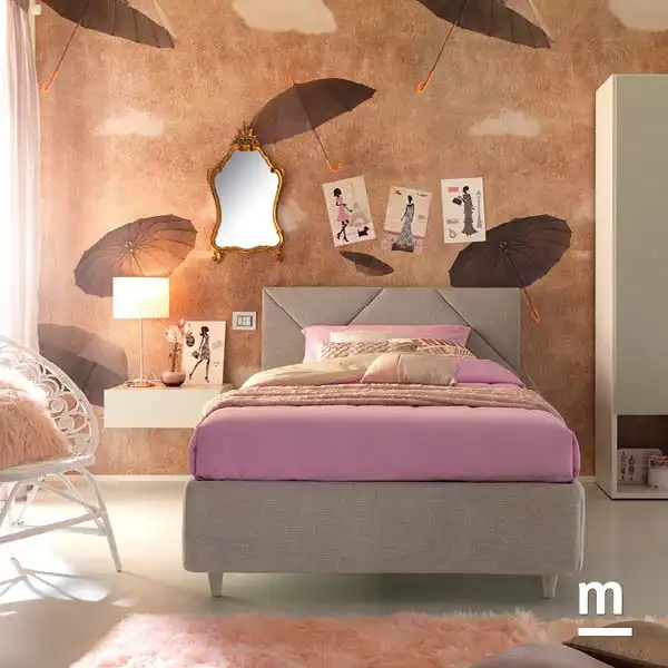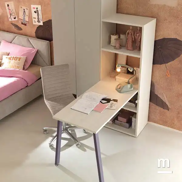 Camera con armadio battente, letto imbottito e libreria con scrivania