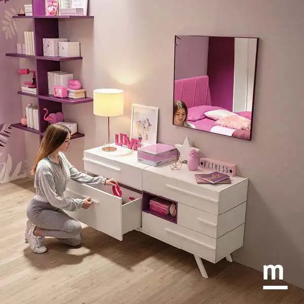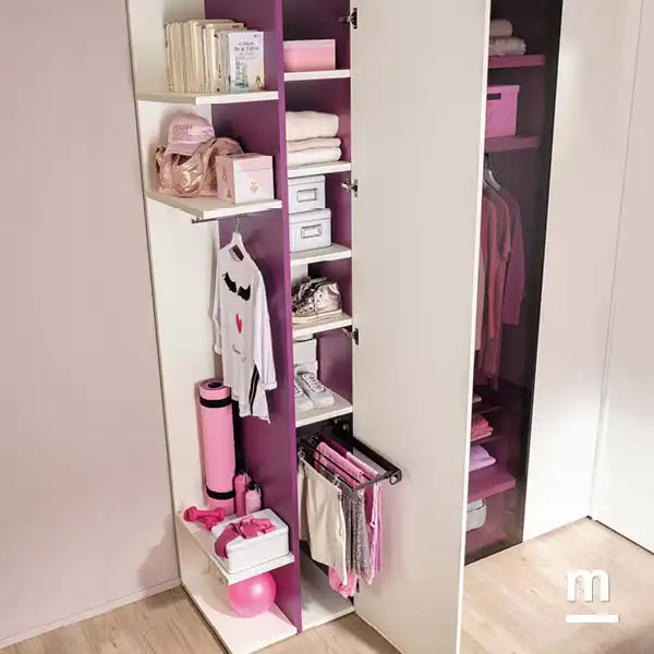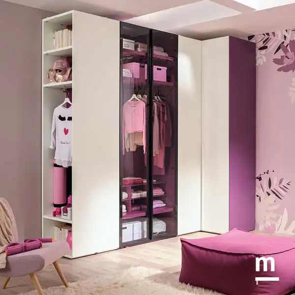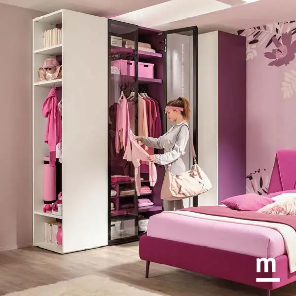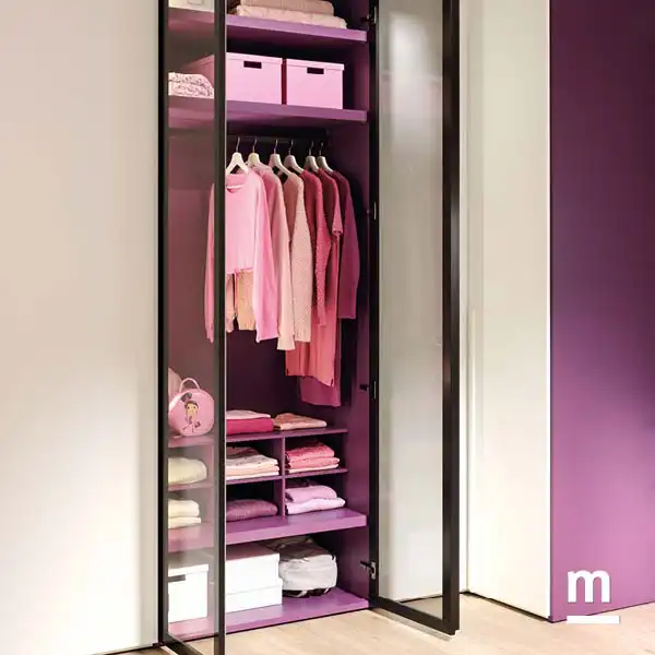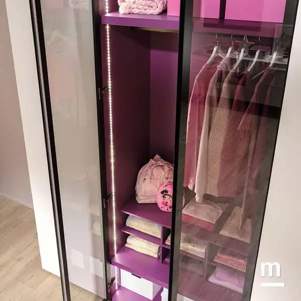 L’armadio di Moretti Compact – AF CASA DESIGN ROMA, zona Eur Ardeatino, si reinventa con ante battenti che combinano pannello e vetro, rivelando un interno laccato color lampone. Le ante in vetro temperato, incorniciate in alluminio, garantiscono resistenza e un tocco di design. L’innovativa barra LED a incasso nel fianco illumina l’intero guardaroba all’apertura dell’anta, offrendo una soluzione sostenibile e pratica, un’idea davvero luminosa per la tua cameretta targata Moretti Compact – AF CASA DESIGN ROMA, zona Eur Ardeatino.