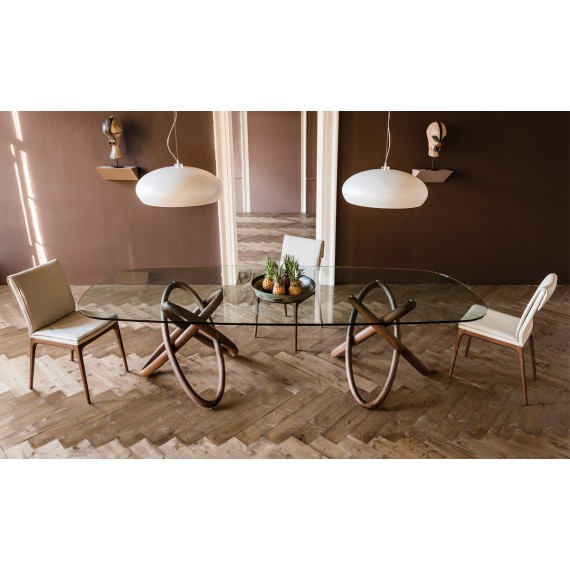 Carioca della Cattelan Italia è un tavolo fisso con base in massello di noce Canaletto. Piano con piastre in cristallo 15mm trasparente o trasparente extrachiaro con bordo bisellato.