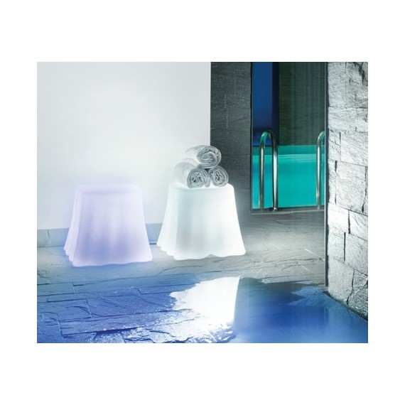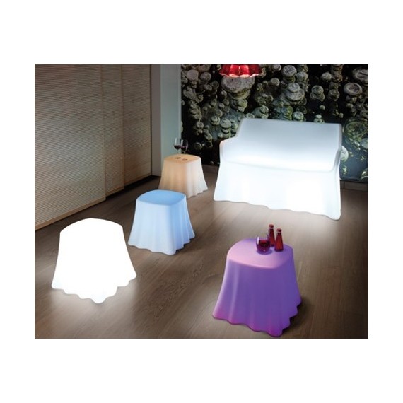 Pouf colorato oppure luminoso in polietilene alimentato con cavo oppure con led rgb e telecomando. Adatto per uso interno o esterno diventa anche un comodo tavolinetto.