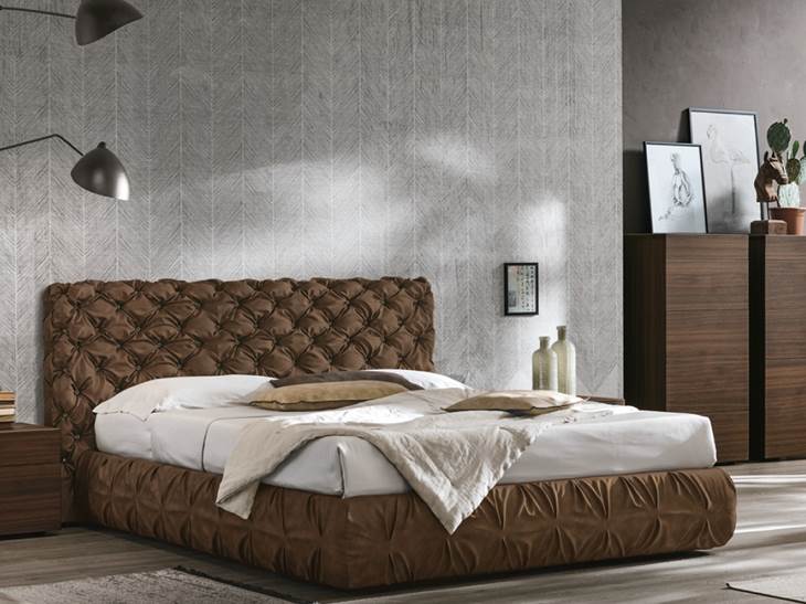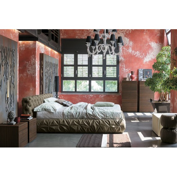 Letto matrimoniale Chantal basso, di Tomasella, con testata e giroletto imbottiti e rivestiti in tessuto con lavorazione capitonnè; disponibile con o senza contenitore. Letto retro finito con, di serie, bottoni rivestiti con lo stesso tessuto del letto. A richiesta, con maggiorazione, applicazione bottoni Swarovski o metallo invecchiato.