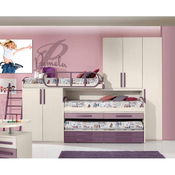 Camera a soppalco dotata di tre letti, una cassettiera e armadi capienti, tutto in una parete.