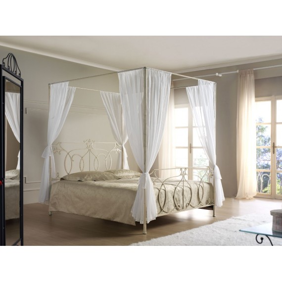 Letto a baldacchino con decori a taglio laser per rete da cm. 160 x 190. Ingombri: cm. 167 x 202, altezza cm. 210
