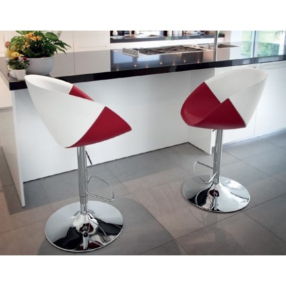 Sgabello girevole con base in acciaio verniciato, scocca in poliuretano imbottita o in poliuretano integrale. Regolabile in altezza con meccanismo a gas. La versione in poliuretano integrale è anche disponibile nella variante bicolore