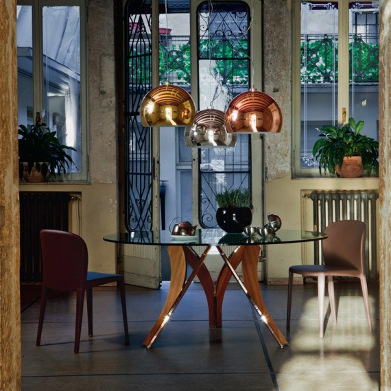 Cortina della Cattelan Italia è un tavolo fisso con base in acciaio inox o noce Canaletto (NC) e acciaio inox o rovere bruciato (RB) e acciaio inox. Piano con piastre in cristallo trasparente 15mm.