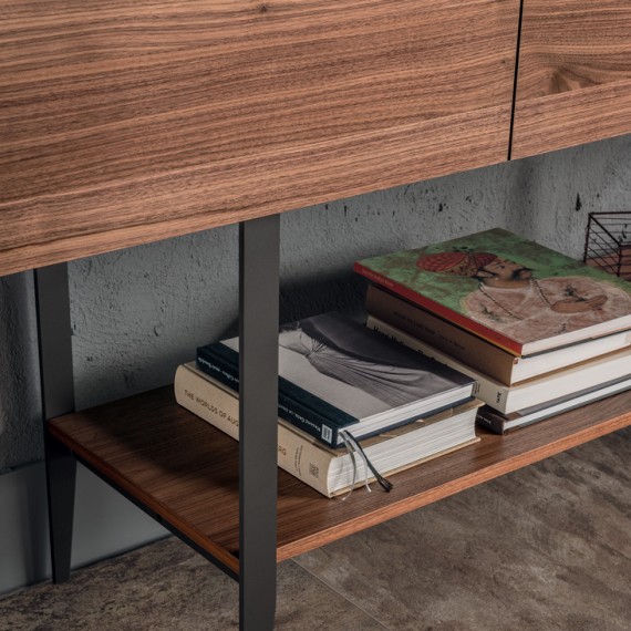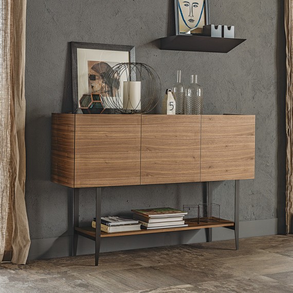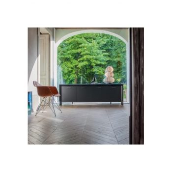Dakota della Cattelan Italia è una madia moderna in legno a 3 o 4 ante in noce Canaletto o rovere bruciato. Top in cristallo extrachiaro acidato verniciato graphite. Base in acciaio verniciato goffrato graphite. Versione A3 e A4 con ripiano inferiore in noce Canaletto o rovere bruciato e fissaggio a parete necessario.