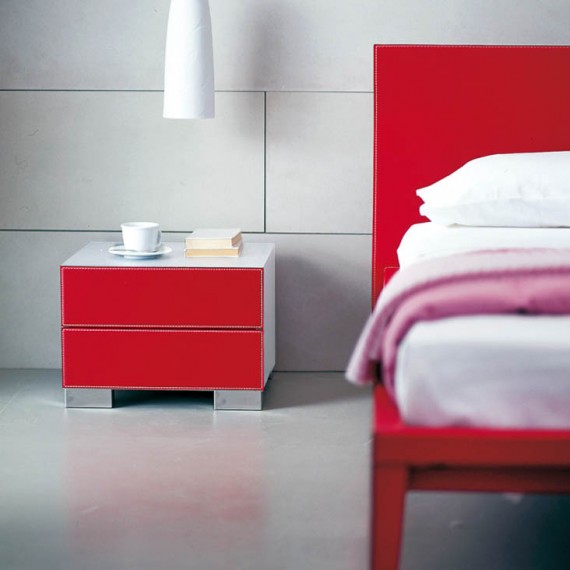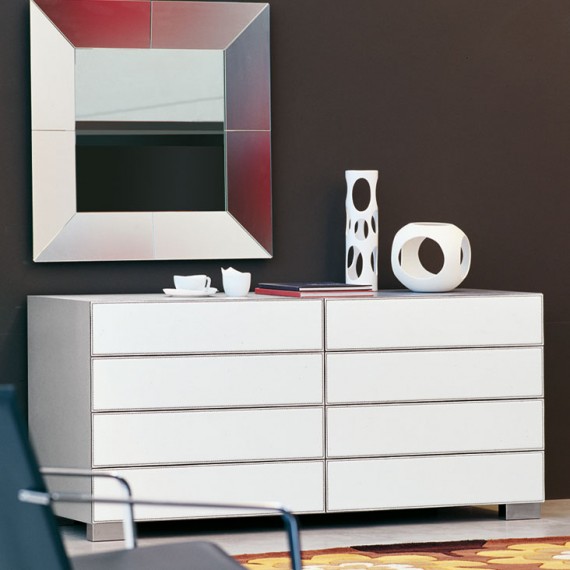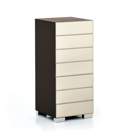 Dandy della Cattelan Italia è un comodino moderno a 2 cassetti, comò a 4/8 cassetti o settimino a 7 cassetti con struttura in noce Canaletto, rovere bruciato o verniciato bianco. Piedi in acciaio inox. Frontali dei cassetti rivestiti in cuoio come da campionario.