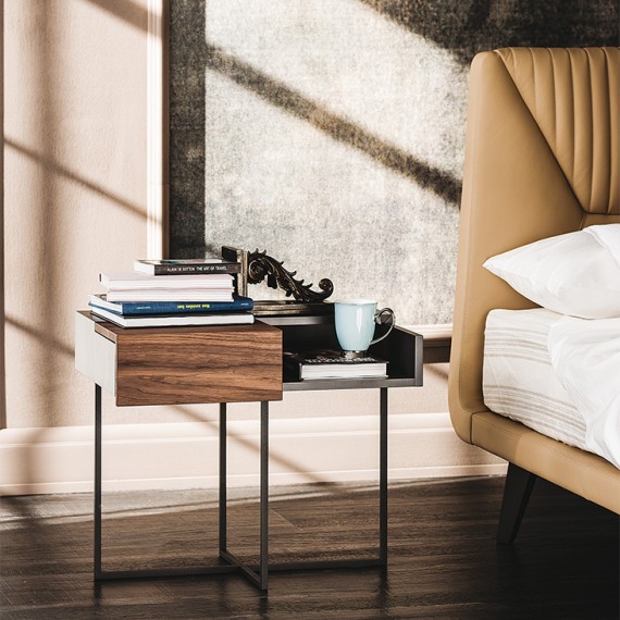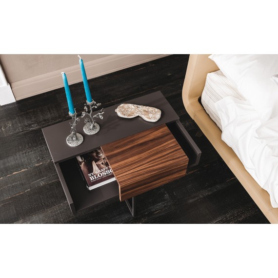 Dante della Cattelan Italia è un comodino moderno con struttura verniciata goffrato graphite o bianco con anta scorrevole in legno noce Canaletto o rovere bruciato. Base in acciaio verniciato goffrato graphite o bianco.