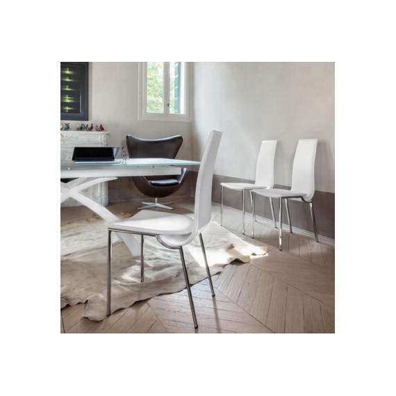 Sedia con struttura in metallo cromato rivestita in cuoio. Disegno originale e materia prima di eccellente qualità fanno di Deira un prodotto inimitabile.