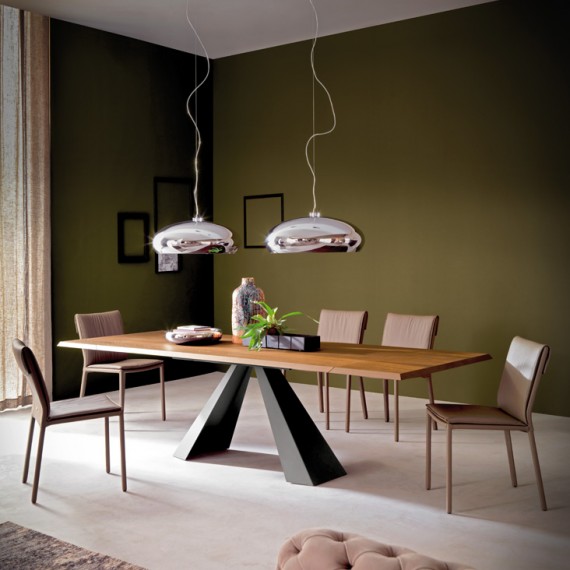 Eliot Wood Drive della Cattelan Italia è un tavolo allungabile con base in acciaio verniciato goffrato bianco (GFM71), nero (GFM73), graphite (GFM69) o inox satinato.