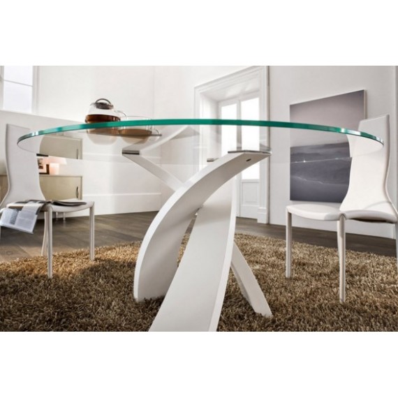 Tavolo fisso con base in metallo curvato e verniciato, piano in vetro temperato elettro-saldato a raggi UV su piastra d’acciaio per una maggiore qualità e ricercatezza estetica. Disponibile anche nella versione tricolore.
