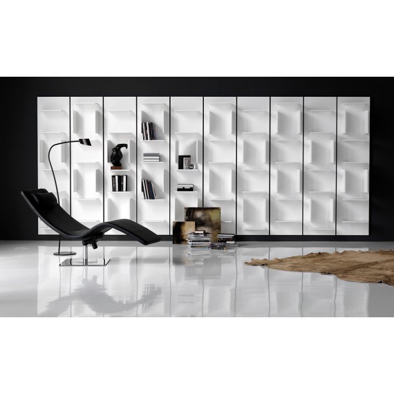Fifty della Cattelan Italia è una libreria componibile a muro in legno laccato bianco goffrato fine. Fornita di attacchi per aggancio sopra/sotto.