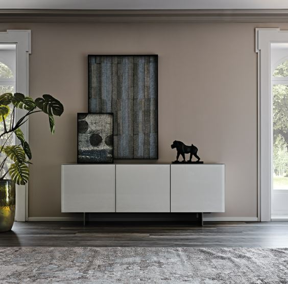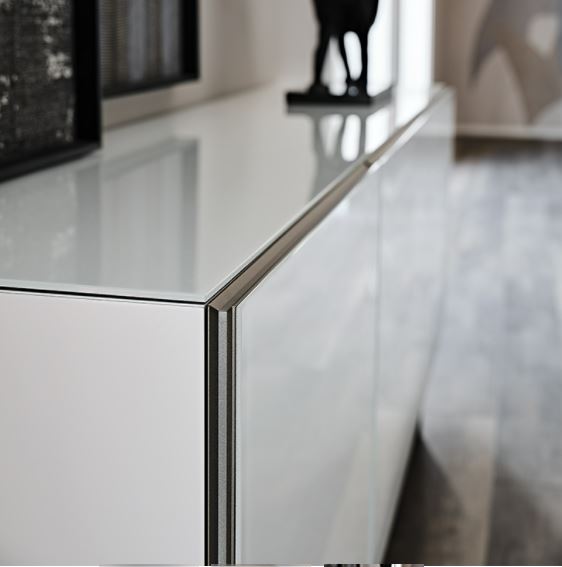 Madia contenitore realizzabile sia a due o tre ante, in legno laccato bianco; le ante sono realizzate in cristallo extrachiaro verniciato bianco e profili in alluminio verniciato titanio goffrato, piedini in acciaio inox lucido o verniciati bianco opaco, ripiani interni in cristallo trasparente.