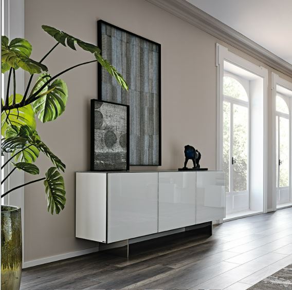La madia di design modello Focus, è interamente realizzata in cristallo verniciato bianco, ciò restituisce un effetto molto luminoso quasi specchiato, che si adatta perfettamente in ambientazioni moderne soprattutto minimaliste.