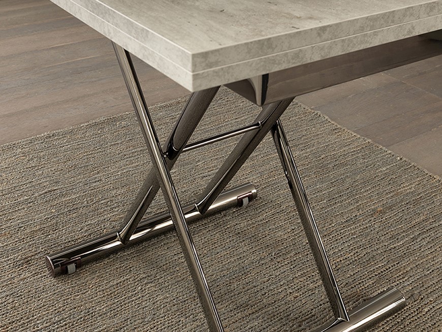 Realizzato con base in metallo, meccanismo a gas, regolabile in altezza al millimetro da cm 25 a cm 78, piano a libro raddoppiabile in lunghezza in nobilitato, legno, effetto malta, vetro o ceramica. Ruote a scomparsa.