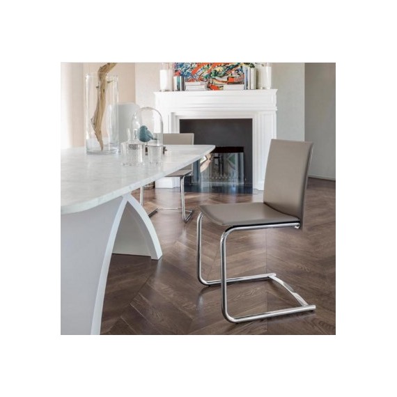 Sedia con struttura a slitta in metallo cromato e rivestita cuoio. Ginza è stata pensata sia per le sale da pranzo sia per studi più esigenti.