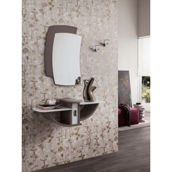 Consolle con coperchio in bianco lucido con piani in vetro nero, specchiera bianco lucido e appendini in alluminio