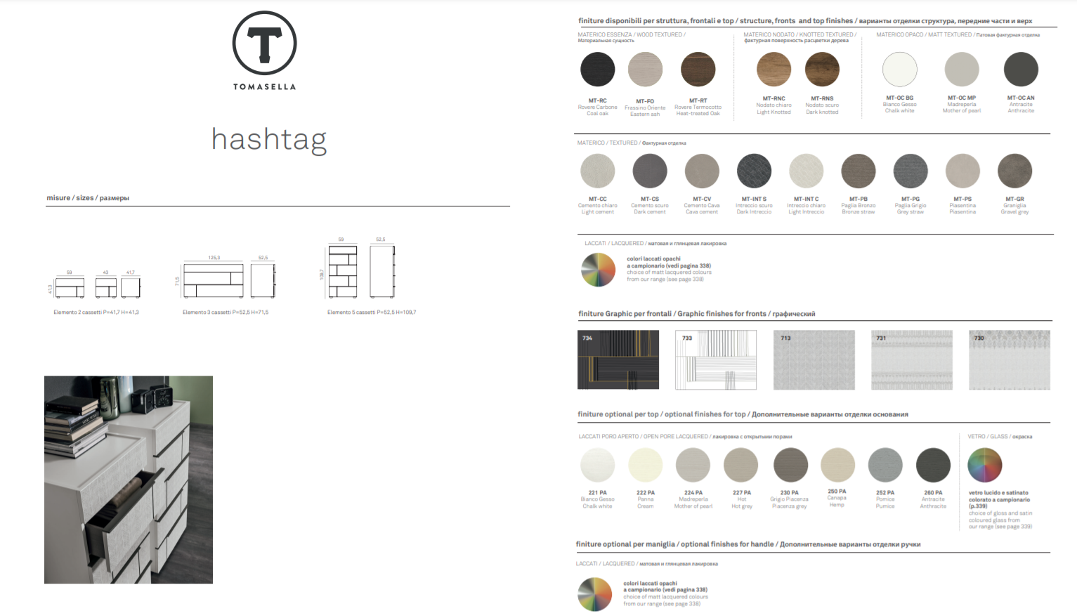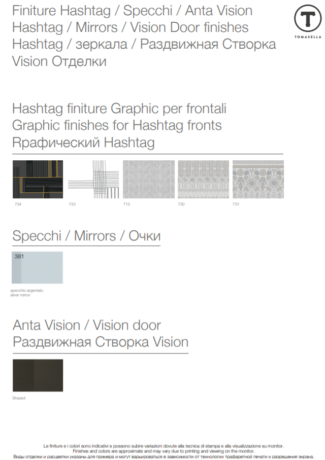 Finiture disponibili per struttura, frontali e top: materico opaco / materico nodato / materico / colori laccati opachi / vetro lucido / vetro satinato