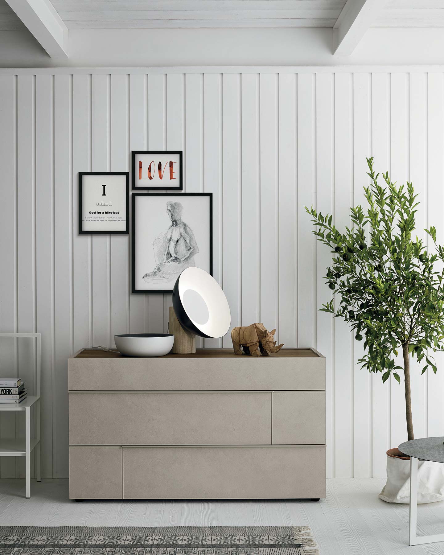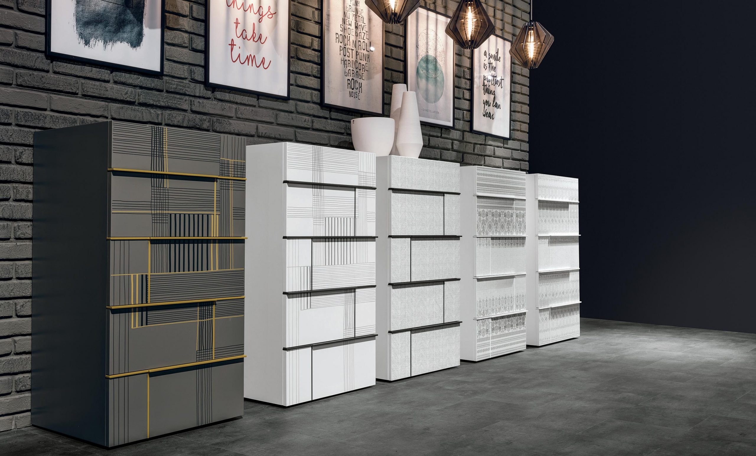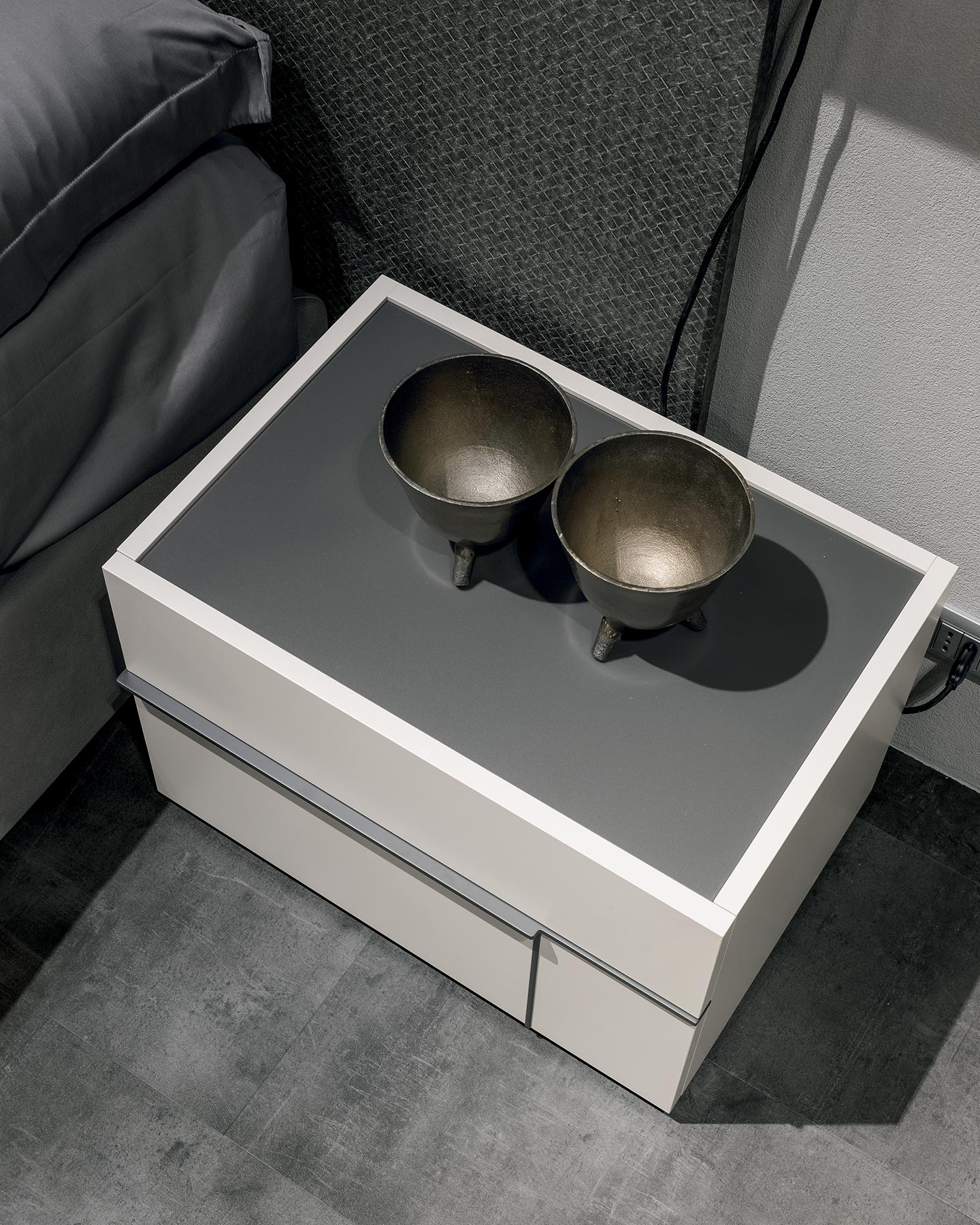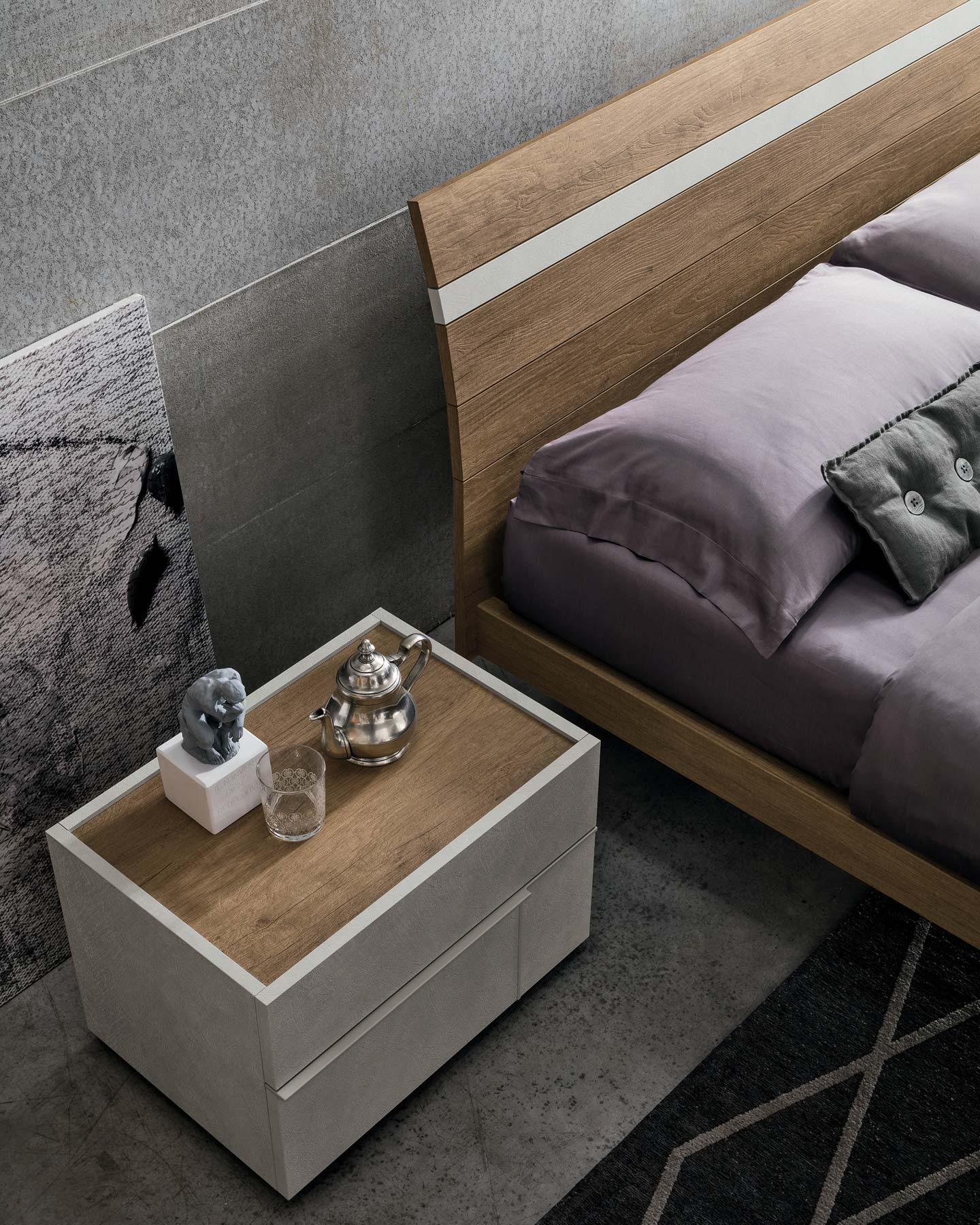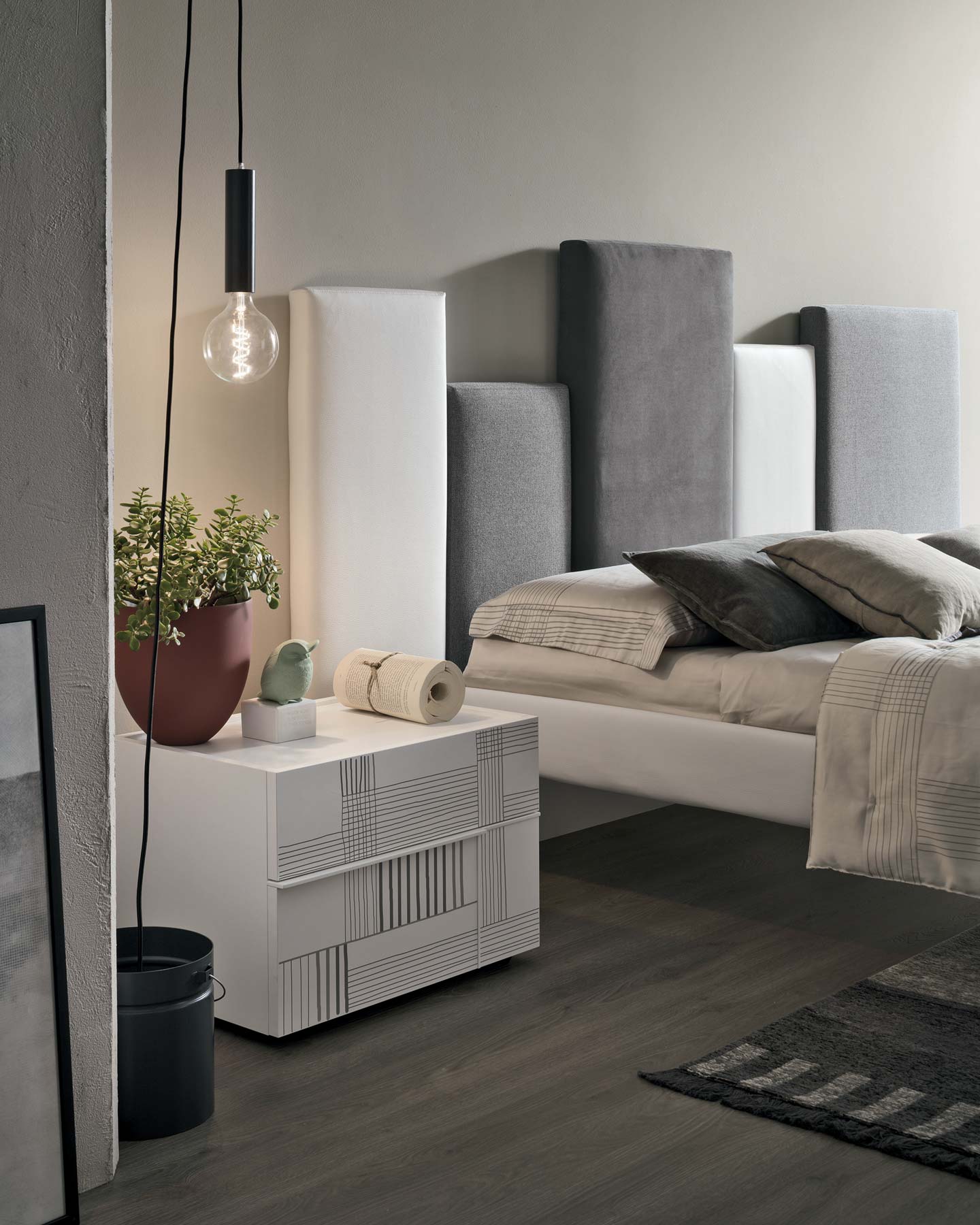 Il gruppo letto Hashtag presenta una selezione di mobili per arredare con gusto moderno la camera da letto: comodini, comò, settimanali.