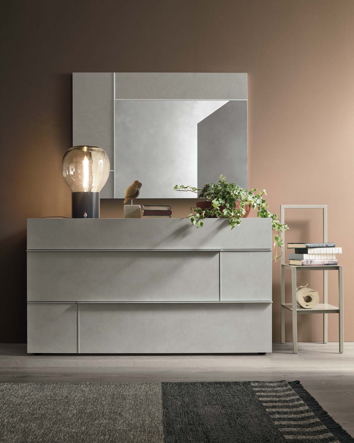 Specchiere Hashtag in materico opaco madreperla con profilo laccato opaco antracite 160 e specchio argentato.