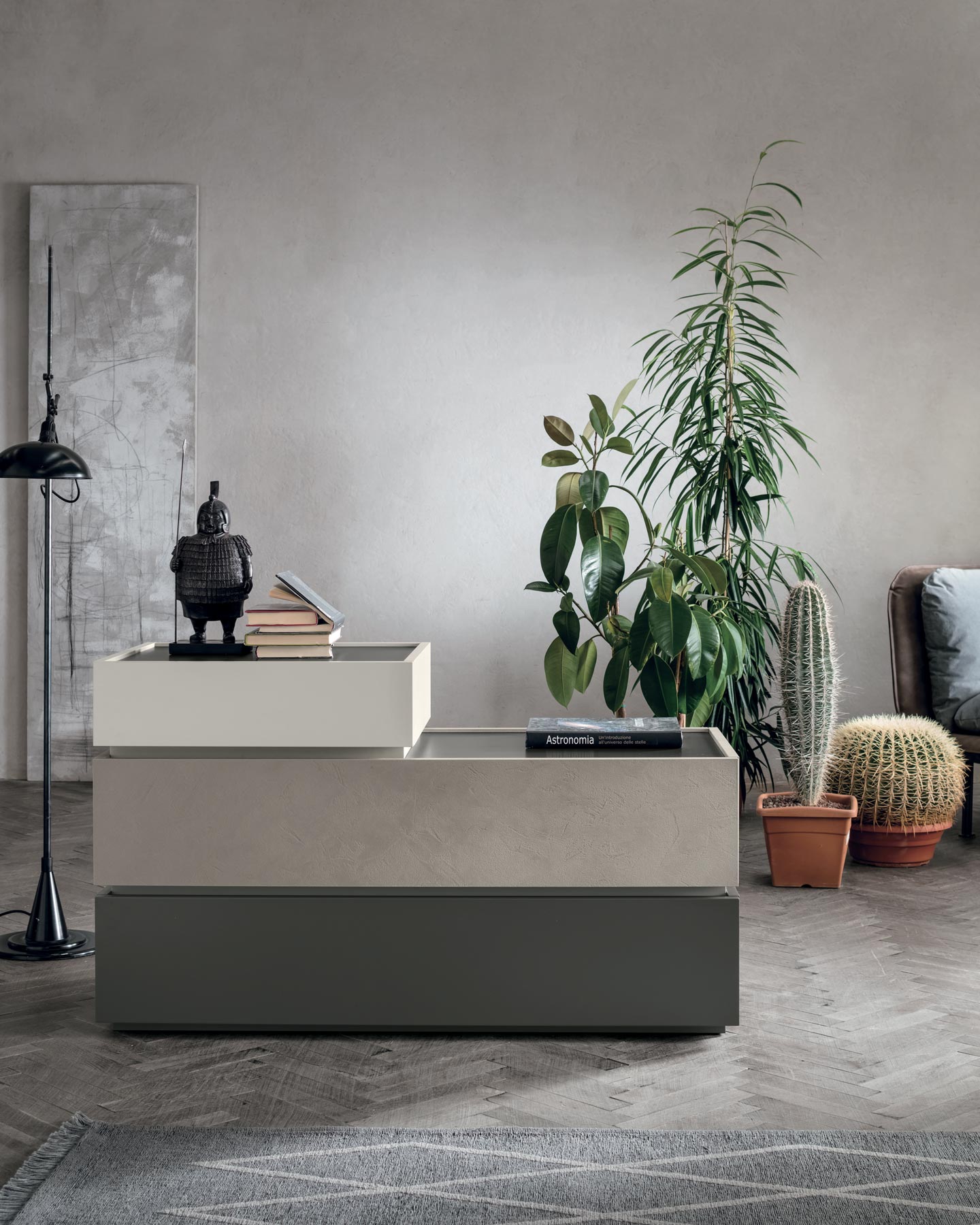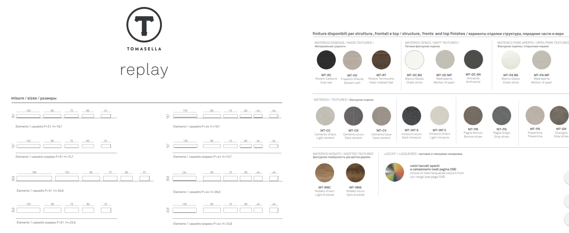 Finiture disponibili per struttura, frontali e top: materico essenza / materico opaco / materico poro aperto / materico / materico nodato / colori laccati opachi