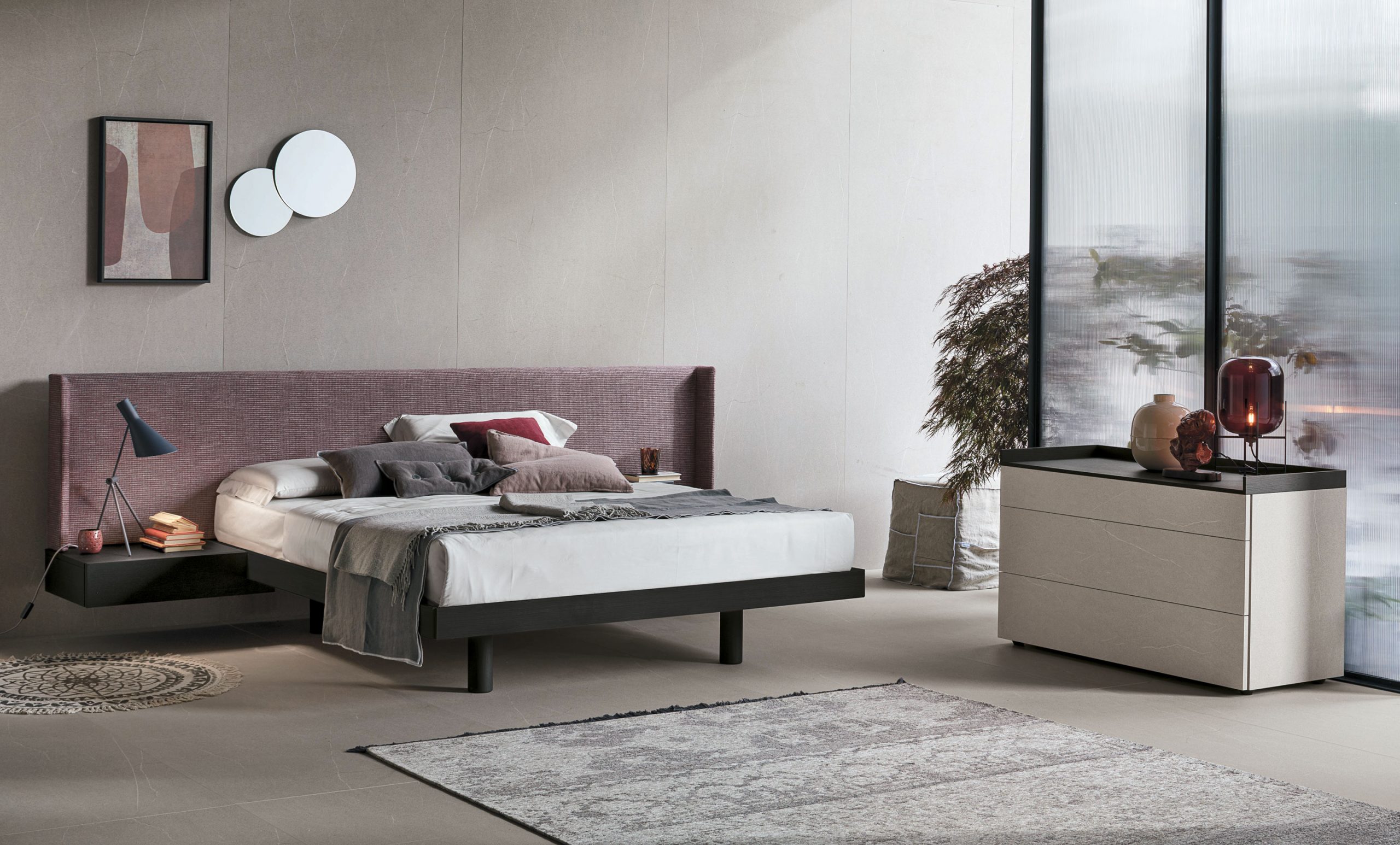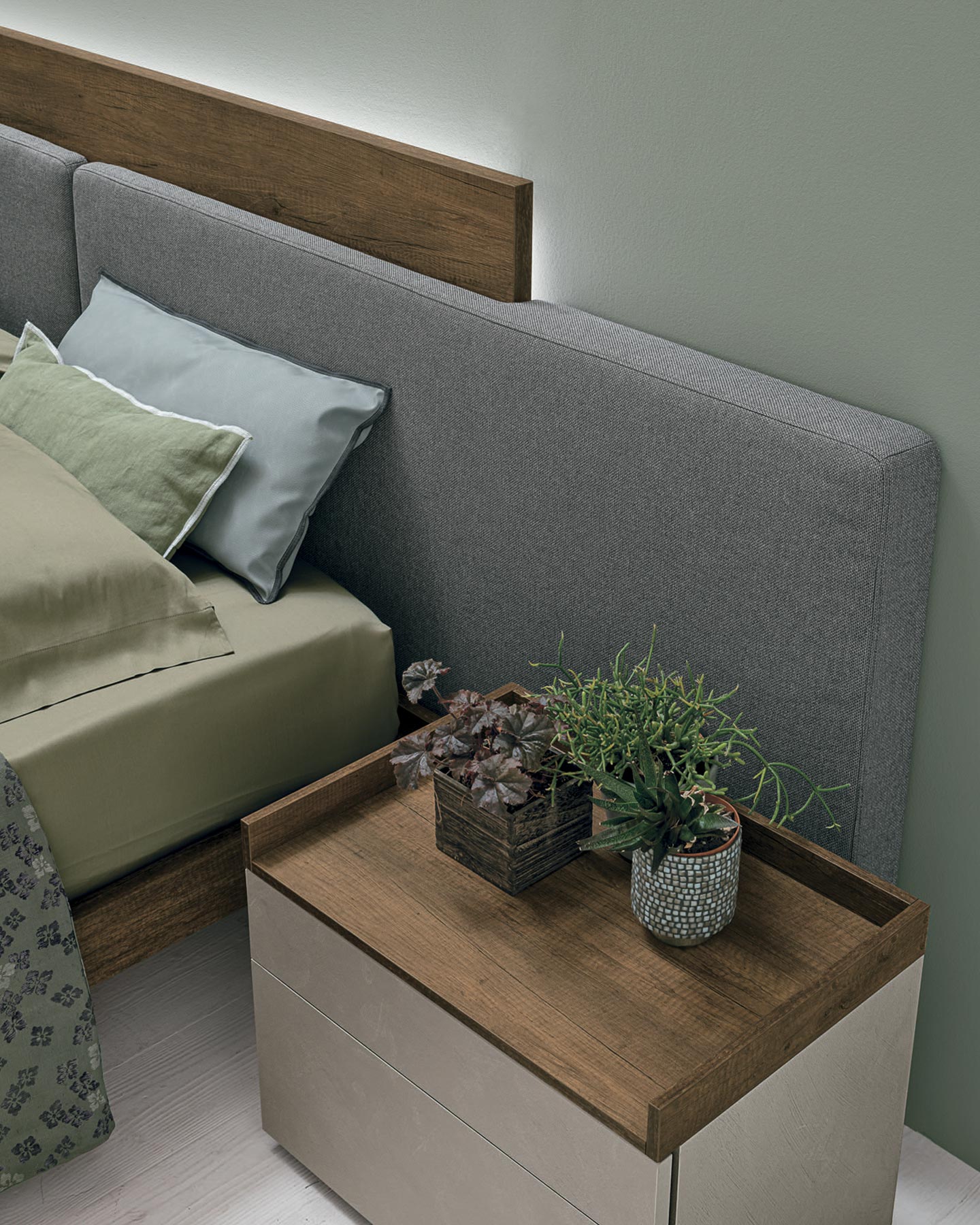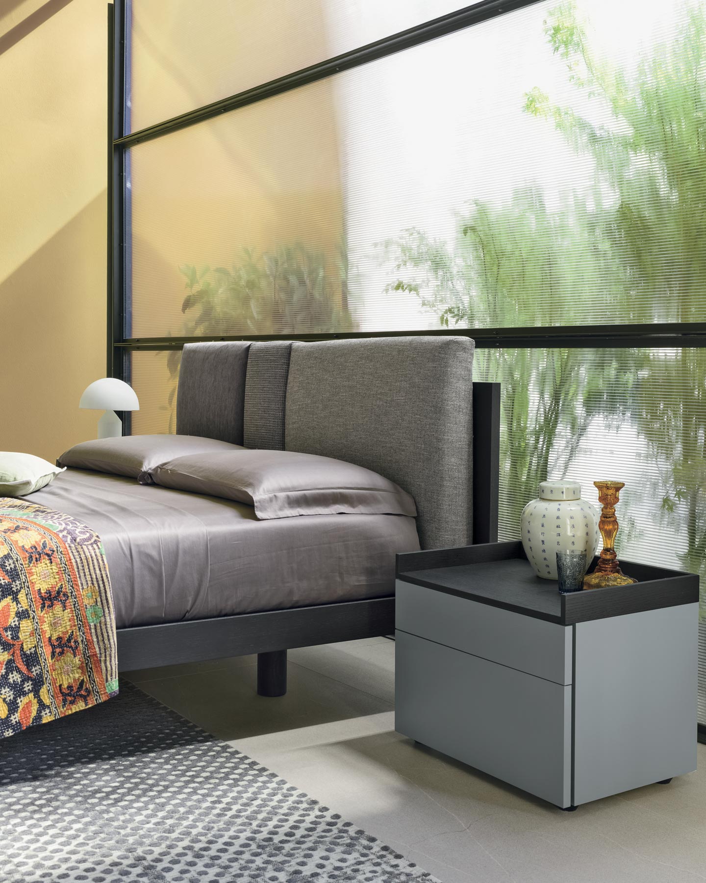 Nel gruppo letto moderno Sir, di Tomasella, il top a vassoio è dettaglio di stile e un originale piano d’appoggio.