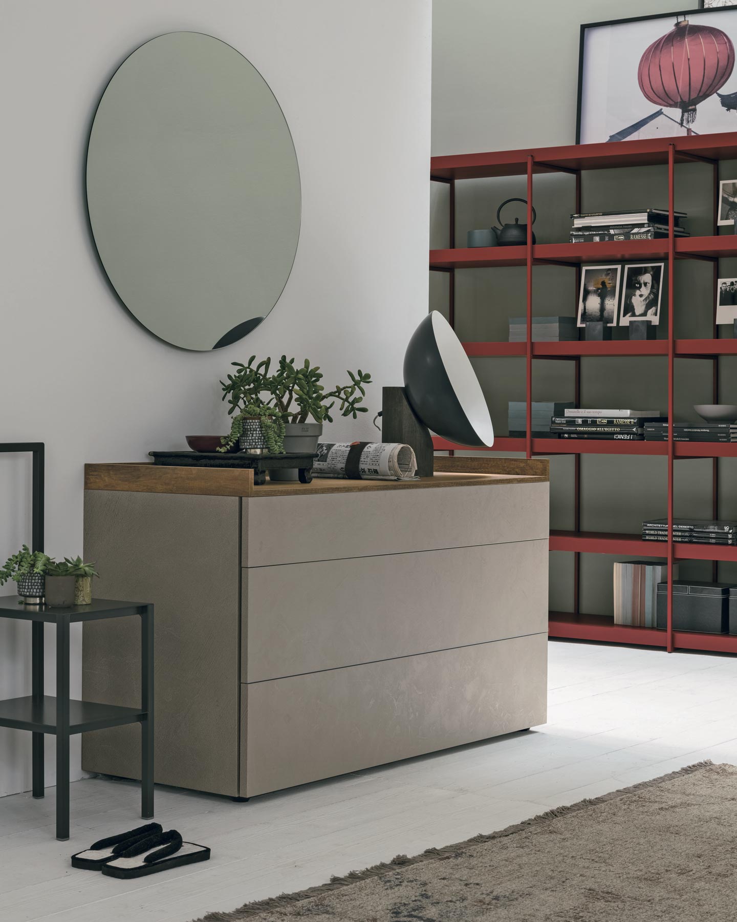 Finiture della foto / Comodini e comò Sir in materico cemento cava e top a vassoio materico nodato scuro.