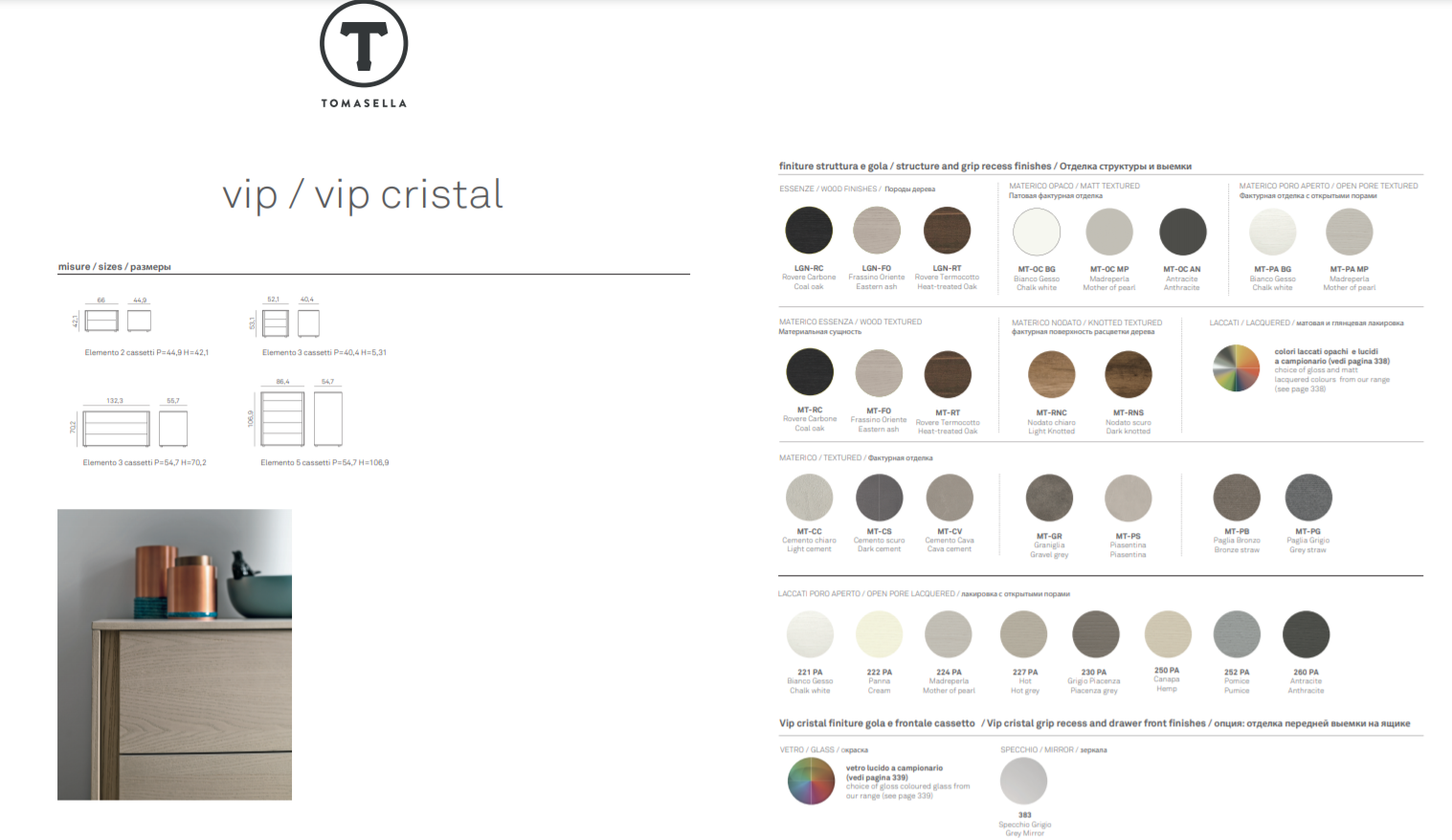 Finiture struttura e gola: essenze / materico opaco / materico poro aperto / materico essenza / materico nodato / colori laccati opachi e lucidi / laccati poro aperto