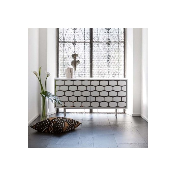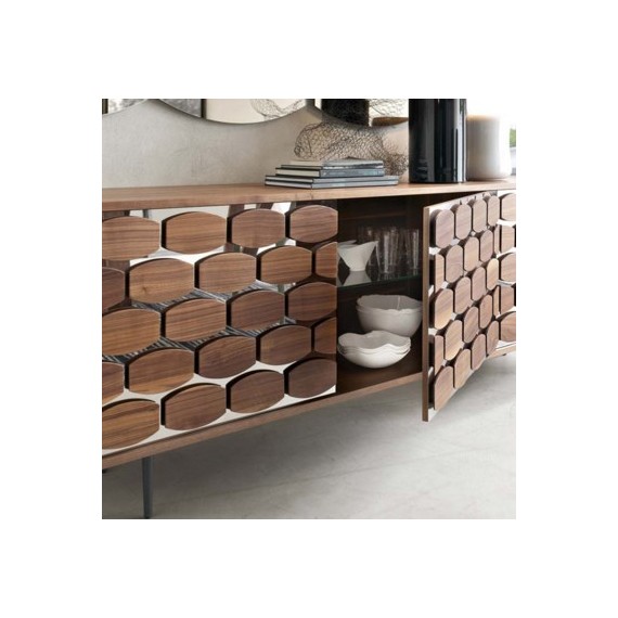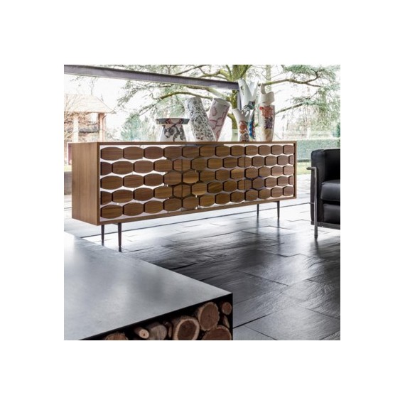Dal concetto di alveare nasce Honey, realizzata con elementi decorativi in legno applicati su fondo a specchio. Un lavoro da mastro artigiano che si concretizza in vero design ispirazione anni ’50.