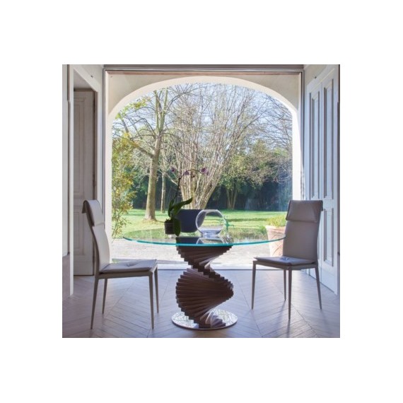 Il legno che diventa scultura per far si che tutto diventi una morbida geometria senza tempo. Noi di Tonin Casa vogliamo sempre distinguerci e fare in modo che le vostre case siano distinguibili.Tavolo fisso con base in listelli di legno accoppiati per una scultura a spirale dall’effetto tridimensionale.Piano in vetro disponibile in diverse dimensioni