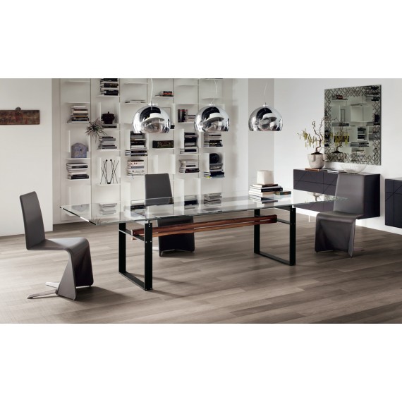 Jerez della Cattelan Italia è un tavolo fisso con base in acciaio verniciato goffrato bianco, nero o graphite e trave centrale in massello naturale di noce Canaletto o acciaio verniciato goffrato bianco, nero o graphite.