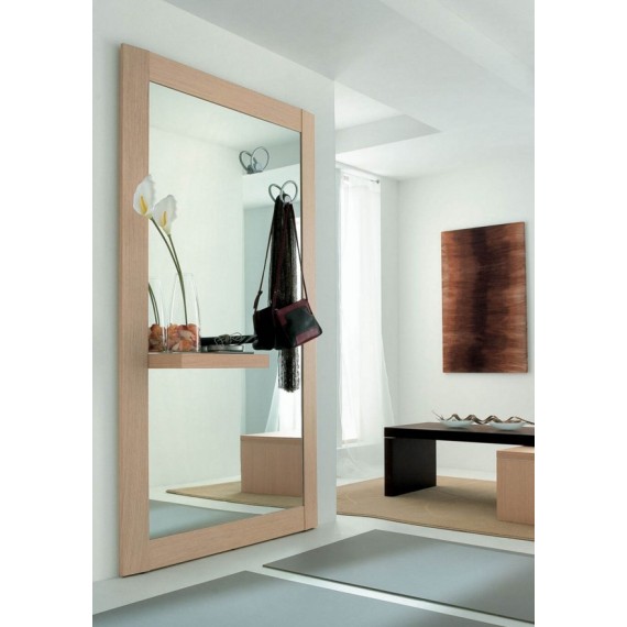 Specchiera attrezzata in rovere o frassino con specchio, mensola in rovere o frassino e appendini in alluminio