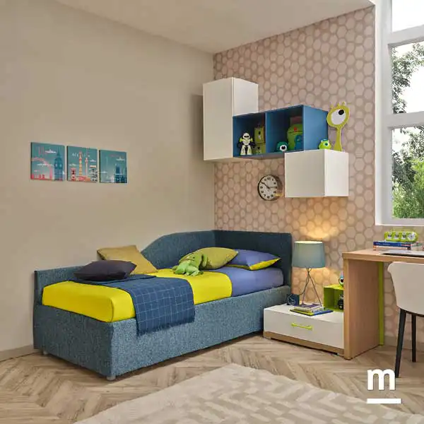 Cameretta con armadio ad angolo, scrivania e divano letto imbottito, ideale per bambini e ragazzi